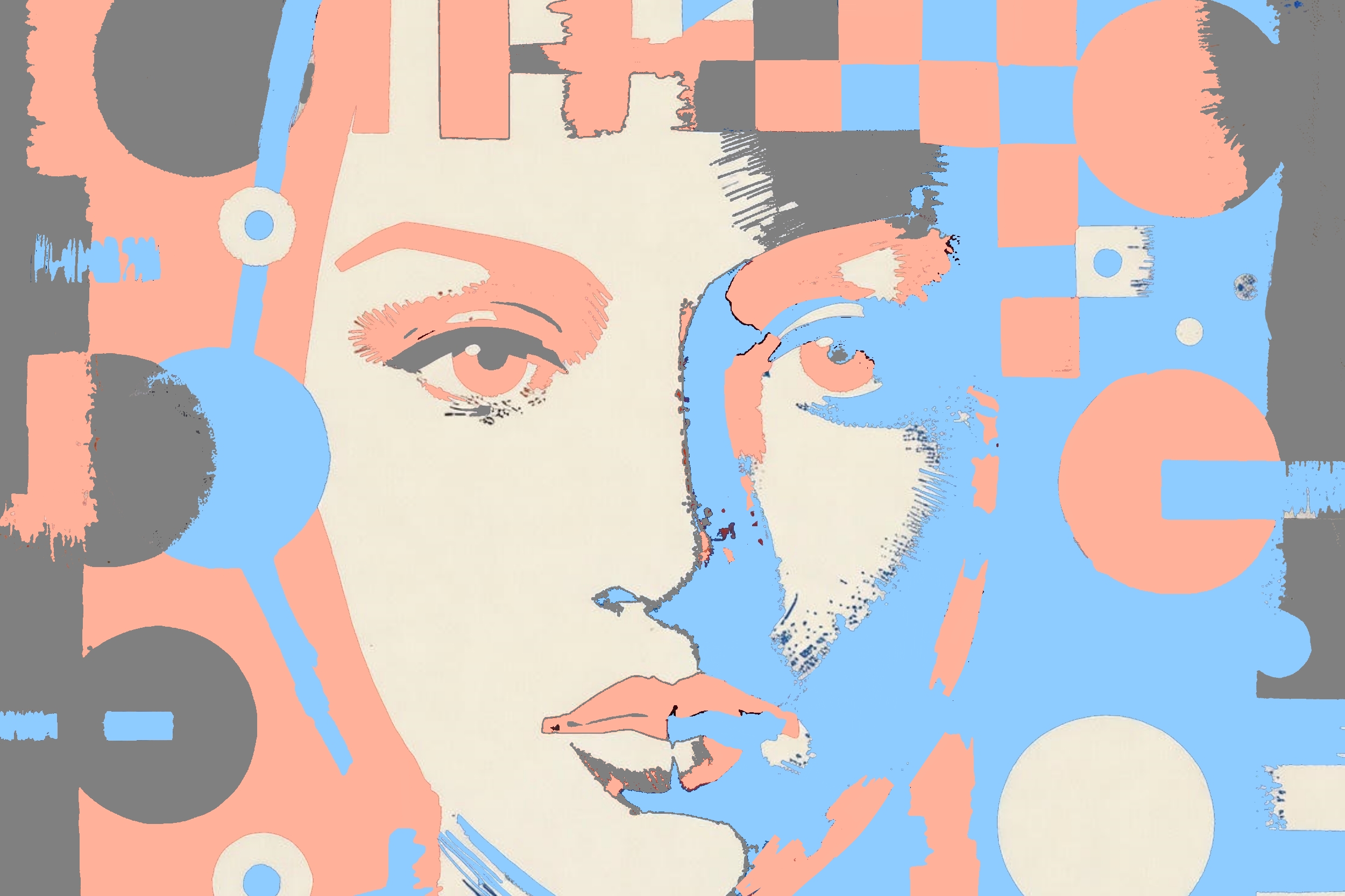 A gray upper half evokes uncertainty and potential harm from mental health campaigns, with pink signaling subtle warnings or false alarms in self-perception. Blue elements provide rational balance, symbolizing nocebo education as a stabilizing force. The downward curve flows into a white base, representing fragile clarity or baseline normality, where a fragmented circle depicts distorted diagnostic cycles-misattributing normal fluctuations as symptoms. Scattered dots and lines mimic fleeting thoughts or ADHD-like distractions amplified by expectations.